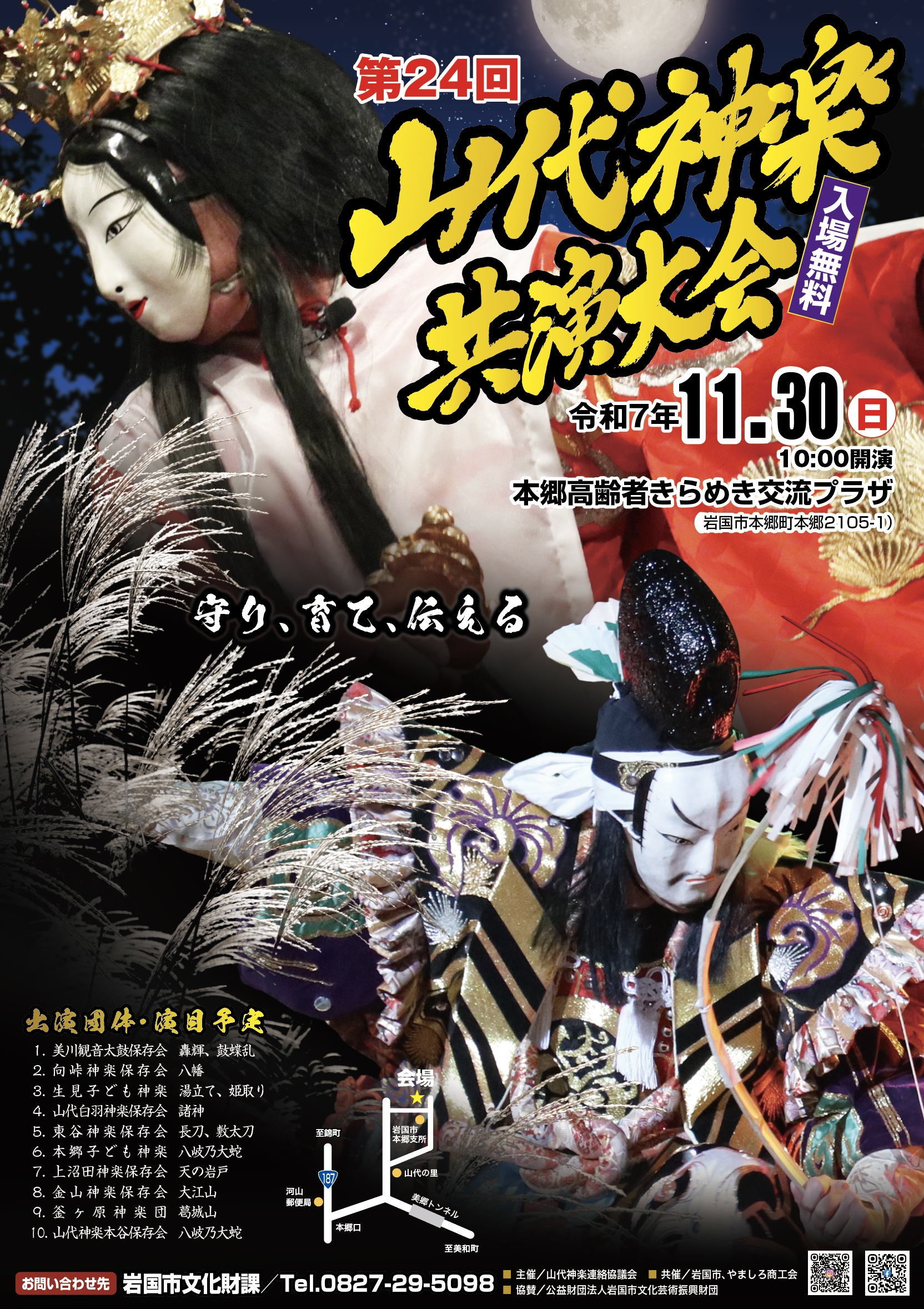 1.岩国太鼓保存会 五橋 2.東谷神楽保存会 天の岩戸 3.小糠踊保存会 岩国小糠踊り 4.美川観音太鼓保存会 轟輝・鼓蝶乱 5.岩国行波の獅子舞保存会 獅子舞 6.嬉野神楽保存会 五龍地鎮祭 7.玖珂太鼓保存会 韋駄天・守破離より「破」・宴 8.上沼田神楽保存会 天の岩戸 9.岩国高校坂上分校神楽クラブ 三鬼 10.山代神楽本谷保存会 八岐大蛇 |